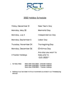 2022 RCT Systems, Inc. Holiday Schedule